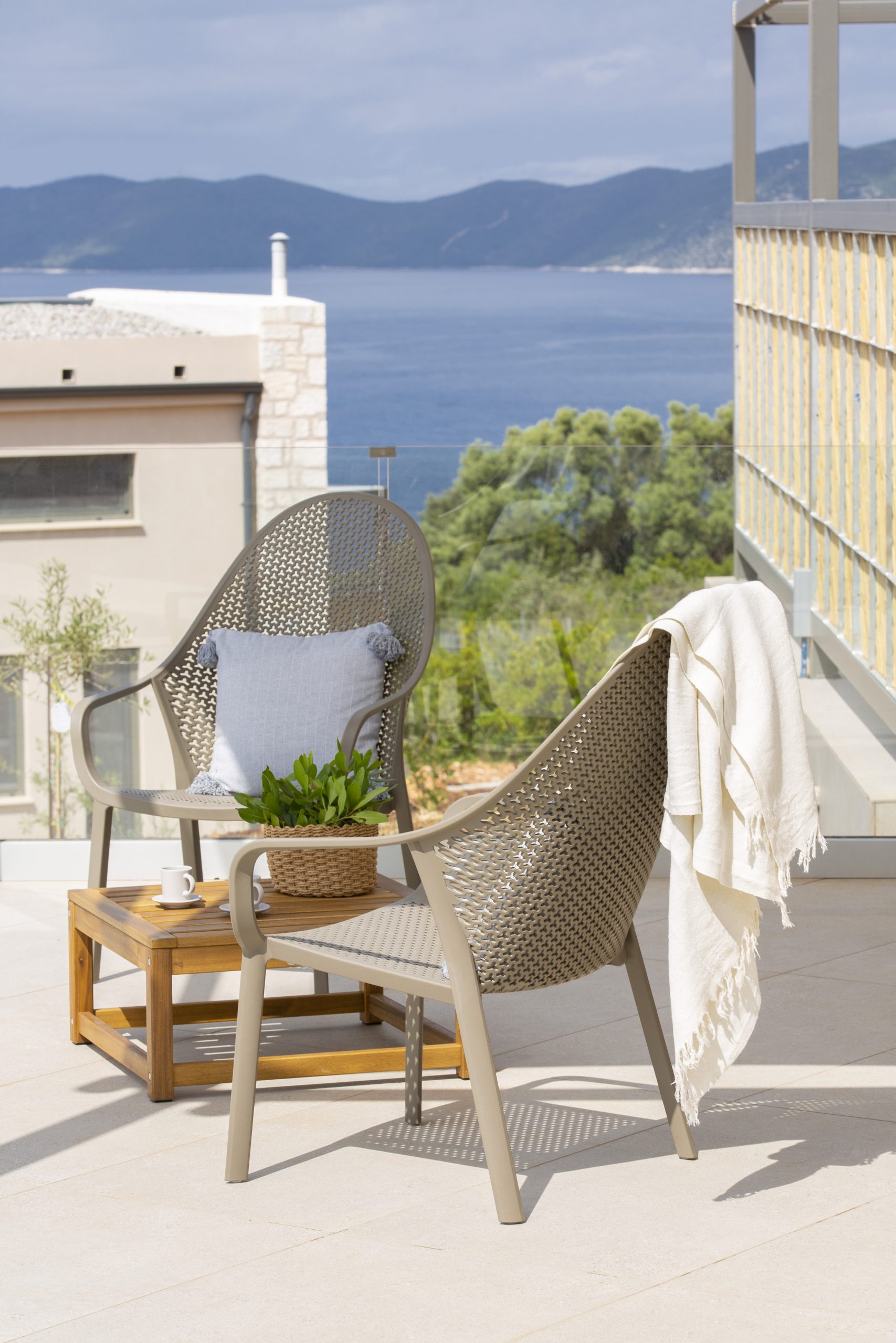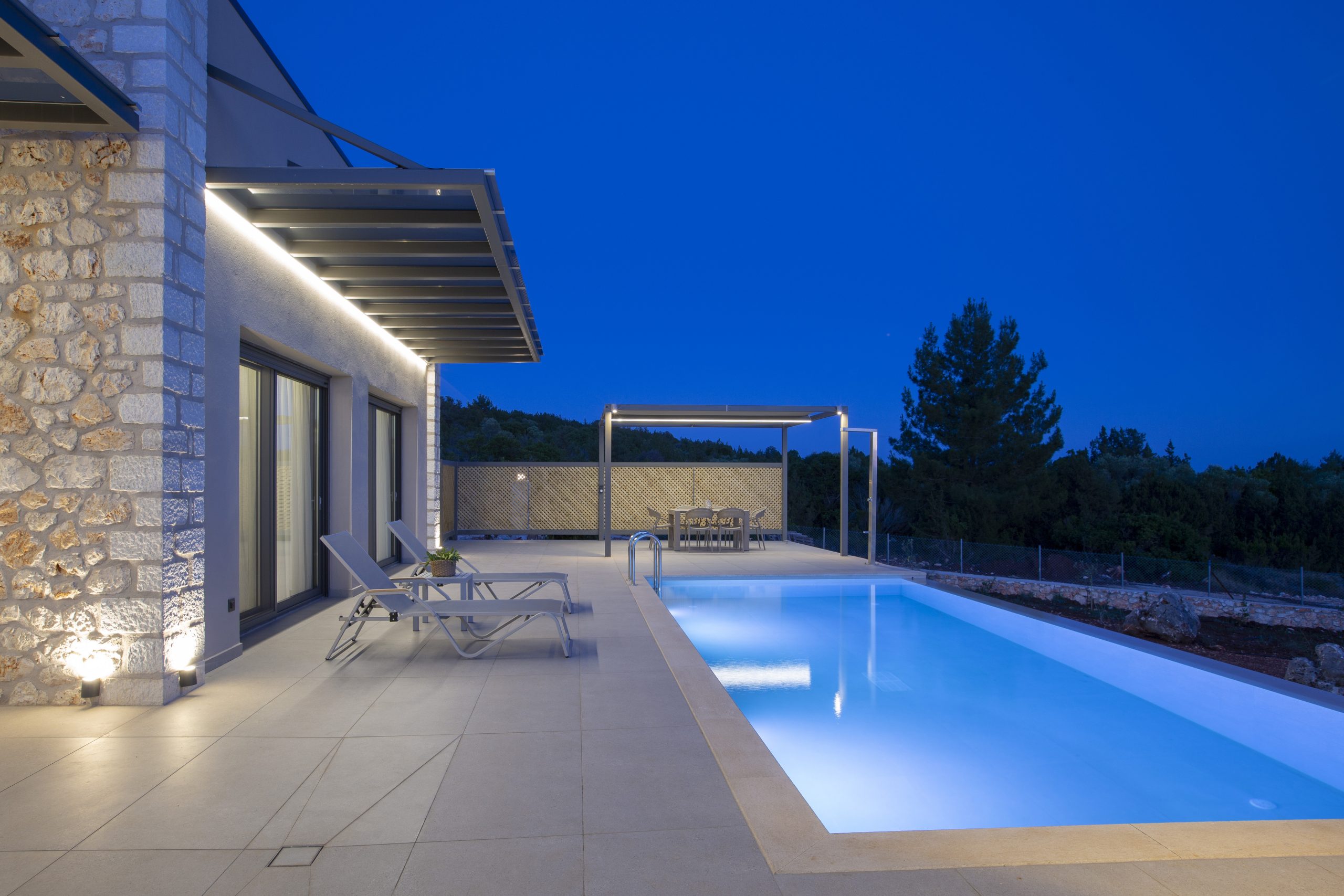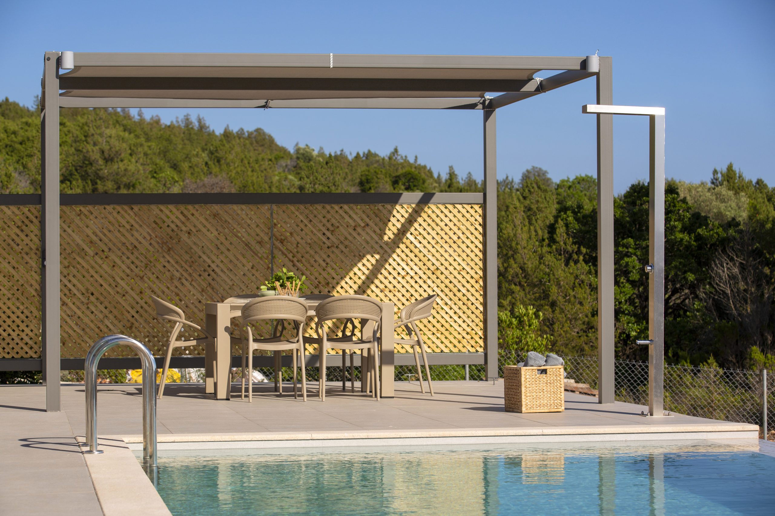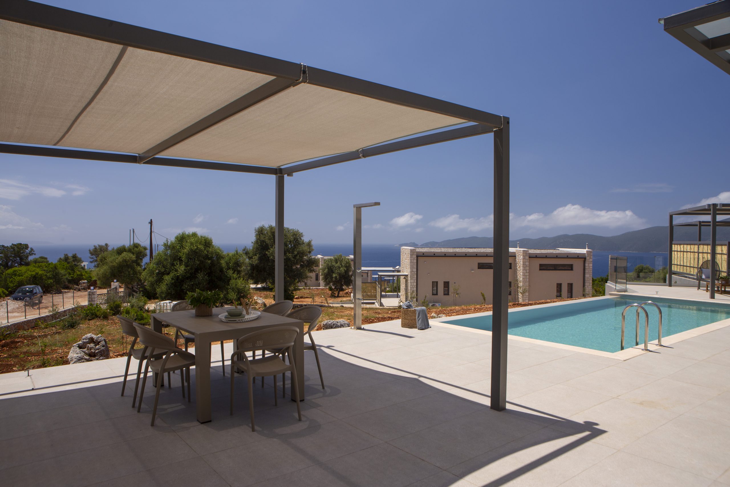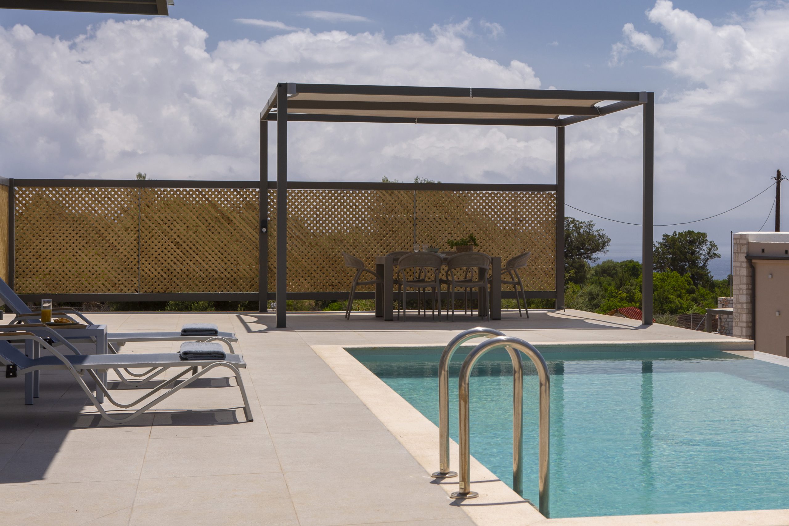 Μια ευρύχωρη βεράντα 170 τ.μ., διαθέτει δύο κιόσκια με σκίαση για να απολαύσετε τον γαλάζιο ορίζοντα δίπλα στην ιδιωτική πισίνα των 8 x3,6 (βάθους 1,5μ.) με υπερχείλιση-καταρράκτη και ενσωματωμένο υδρομασάζ.